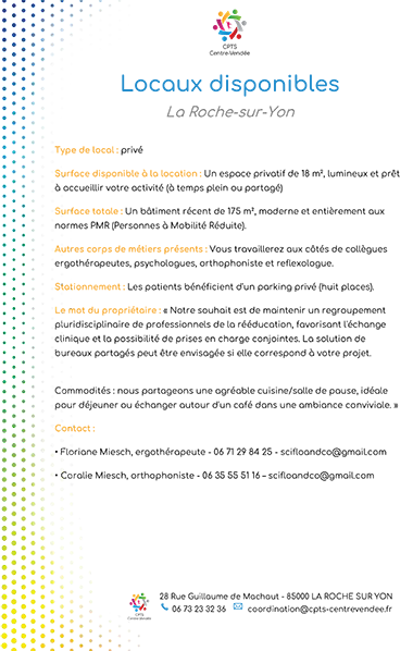 Des bureaux et locaux sont disponibles en Centre-Vendée pour l’exercice médical et paramédical libéral. Retrouvez ici quelques annonces ; si l’une d’elles vous intéresse, vous y trouverez les coordonnées des personnes à contacter. La CPTS offre un espace de consultation mais n’assure aucune gestion de ces locaux.