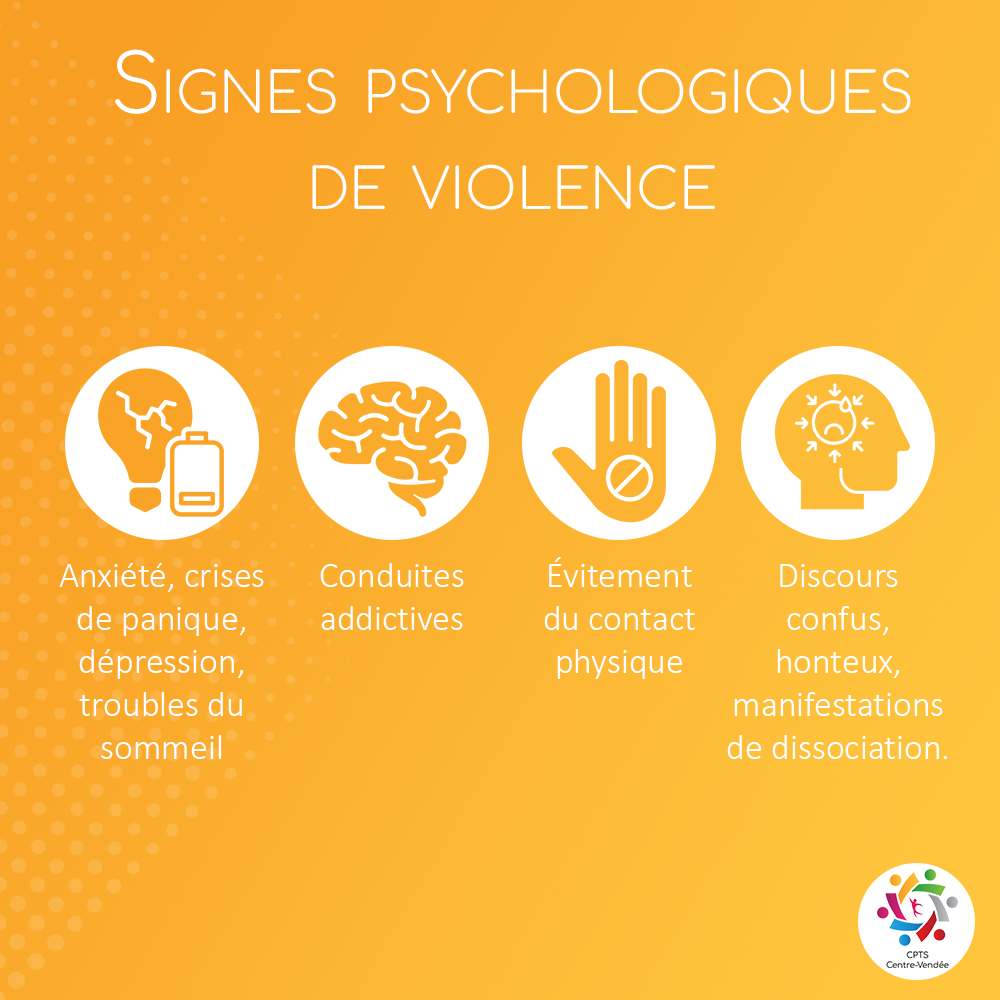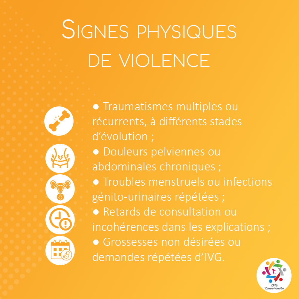 La victime consulte souvent pour un tout autre motif, parfois somatique (douleurs chroniques, troubles gynécologiques, traumatismes) ou psychique (anxiété, dépression, troubles du sommeil).